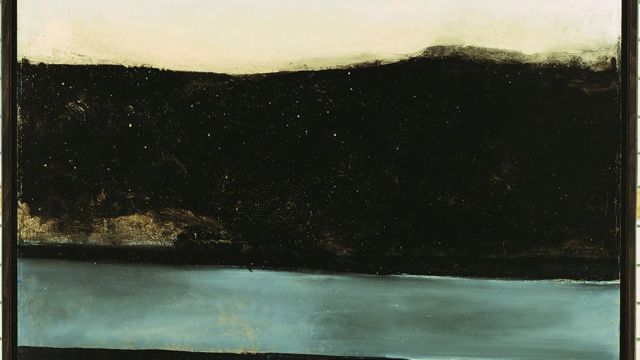In April 1958, Colin McCahon travelled to the US, responding both to the expansiveness of the American landscape and to the modern American paintings that he saw in museums. On his return, his works increased in scale while economizing in gesture: the landscape elements of tomorrow have been reduced to a horizon and lowering sky, with the land bisected by a grey river. He converted his Titirangi garage into a studio, and built an extra bedroom for his children underneath. The studio was gloomy – there was only one small side window for light when the garage door was closed – but it precipitated dozens of new works. Tomorrow was an unfortunate painting, said McCahon, ‘in that it wouldn’t go right, and I got madder and madder. I hurled a whole lovely quart tin of black Dulux at the board and reconstructed the painting out of the mess.’ The black paint (a commercial flooring paint, mixed with sand) dripped down the surface of the work and ran between wide cracks in the studio floorboards, ruining clothes and bed linen in his sons’ room below. He finally finished the painting in May 1959.